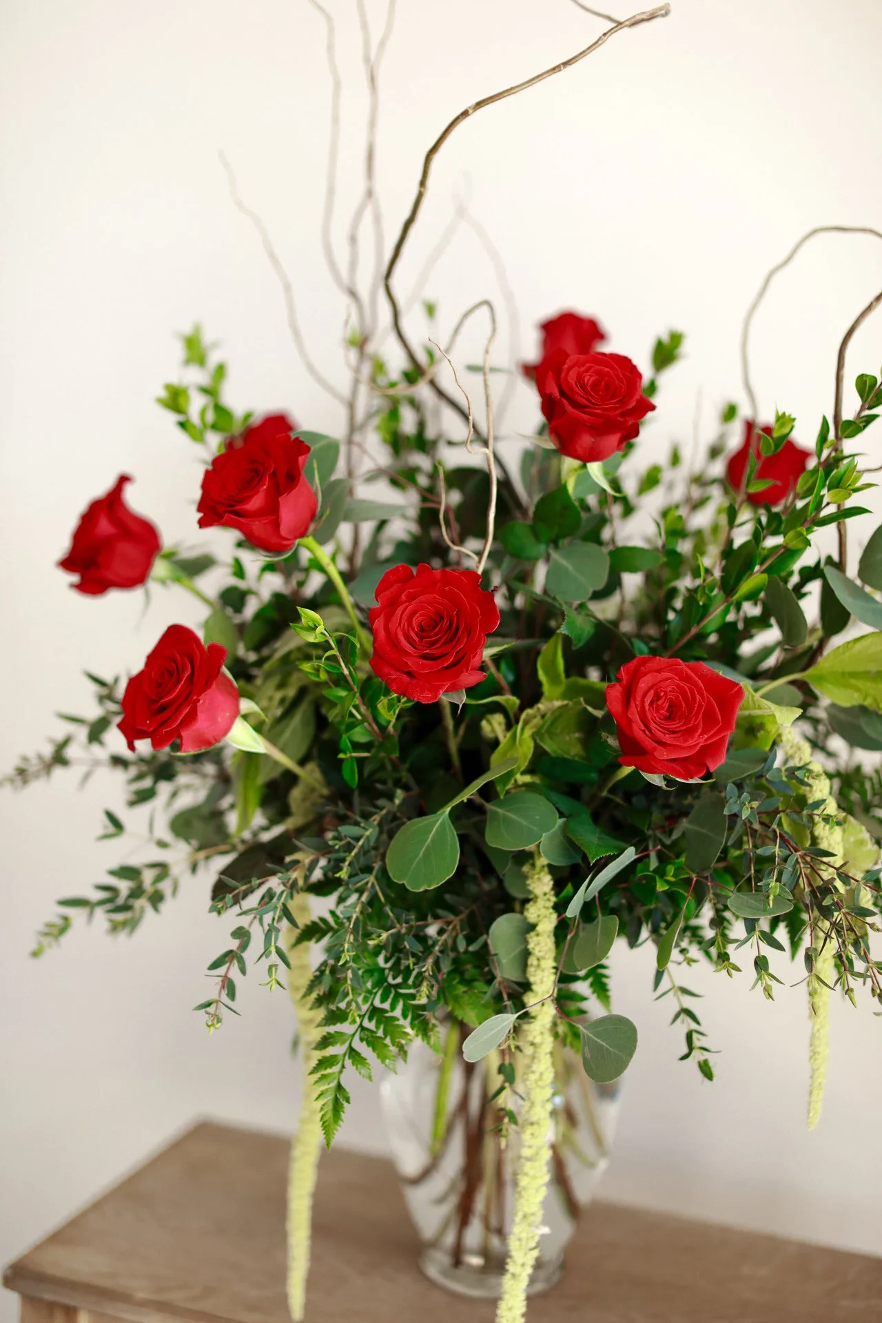 The Enchanted Romance is a twist to the Classic Roses, giving you more of a whimsical vibe. The Enchanted consist of: roses, hanging amaranthus, curly willow, and 4 different types of greenery.